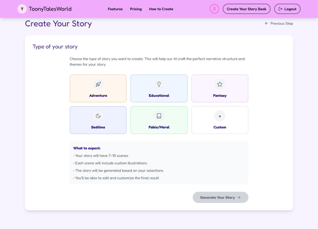 Choose age-appropriate themes (3-8 years old is the biggest market) and click “Generate Your Story”